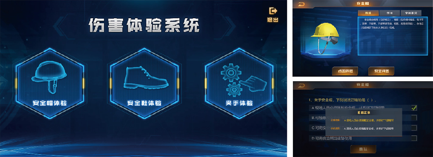 設備包含三大培訓功能,分別是安全帽、安全鞋、機械夾傷,每種培訓功能里又包含三種培訓方式,分別是理論知識教育、安全知識考核、實體傷害體驗,進行理論、考核、實體體驗三位一體綜合培訓。